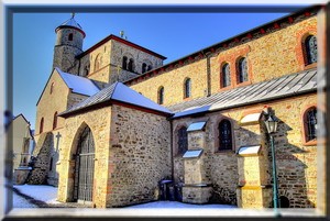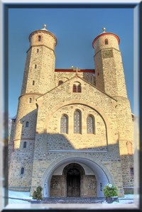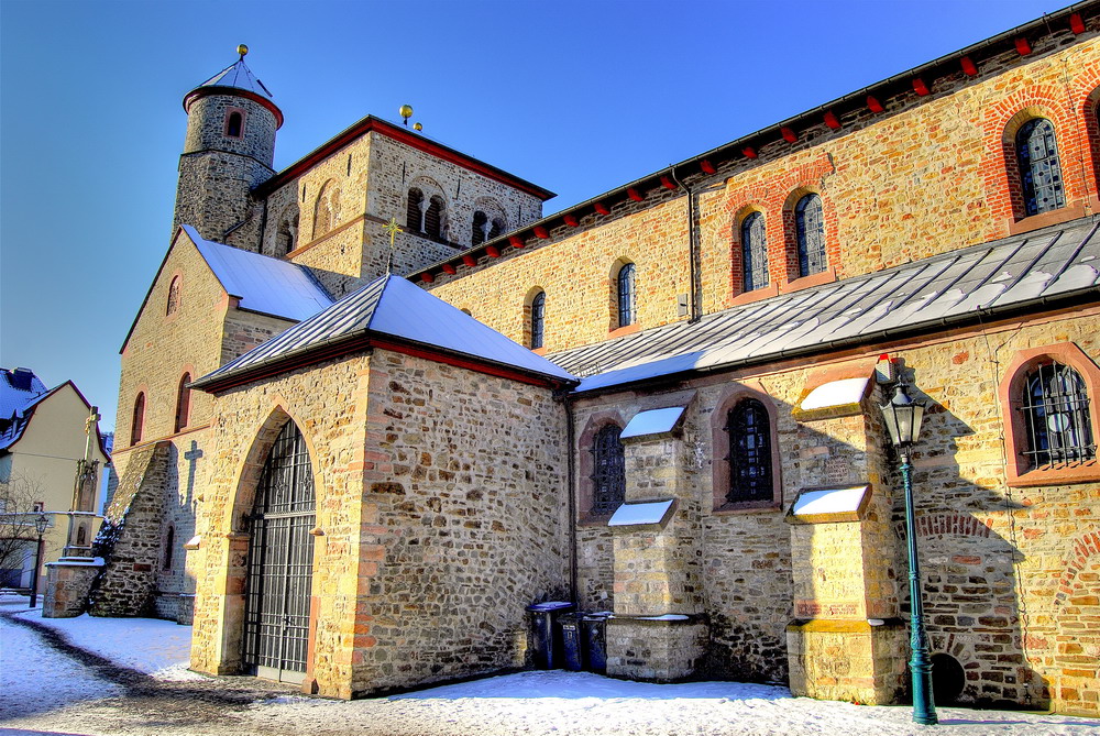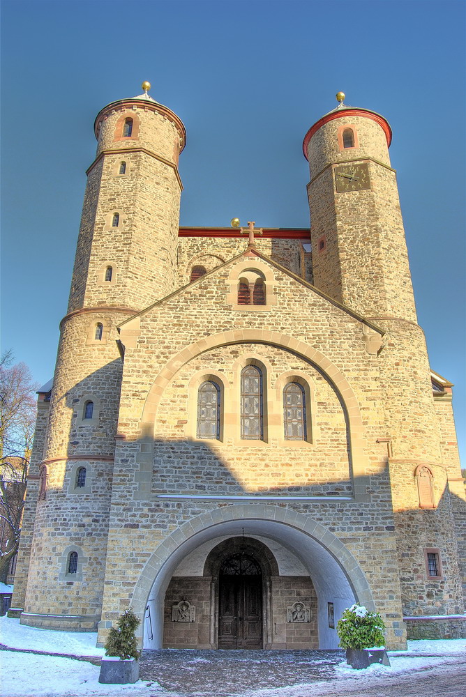 Benediktinermönche errichteten im Jahre 830 ein neues Kloster, das fortan für viele Gläubige als Wallfahrtsort aufgesucht wurde. Nach umfangreichen Änderungen und Erweiterungen erhielt die Kirche im 11. Jahrhundert ihre jetzige Form. Bei dem Bauwerk handelt es sich um eine dreischiffige Pfeilerbasilika, ohne Querschiffe, mit Westwerk und Langchor. Von großer Bedeutung ist auch die Krypta.