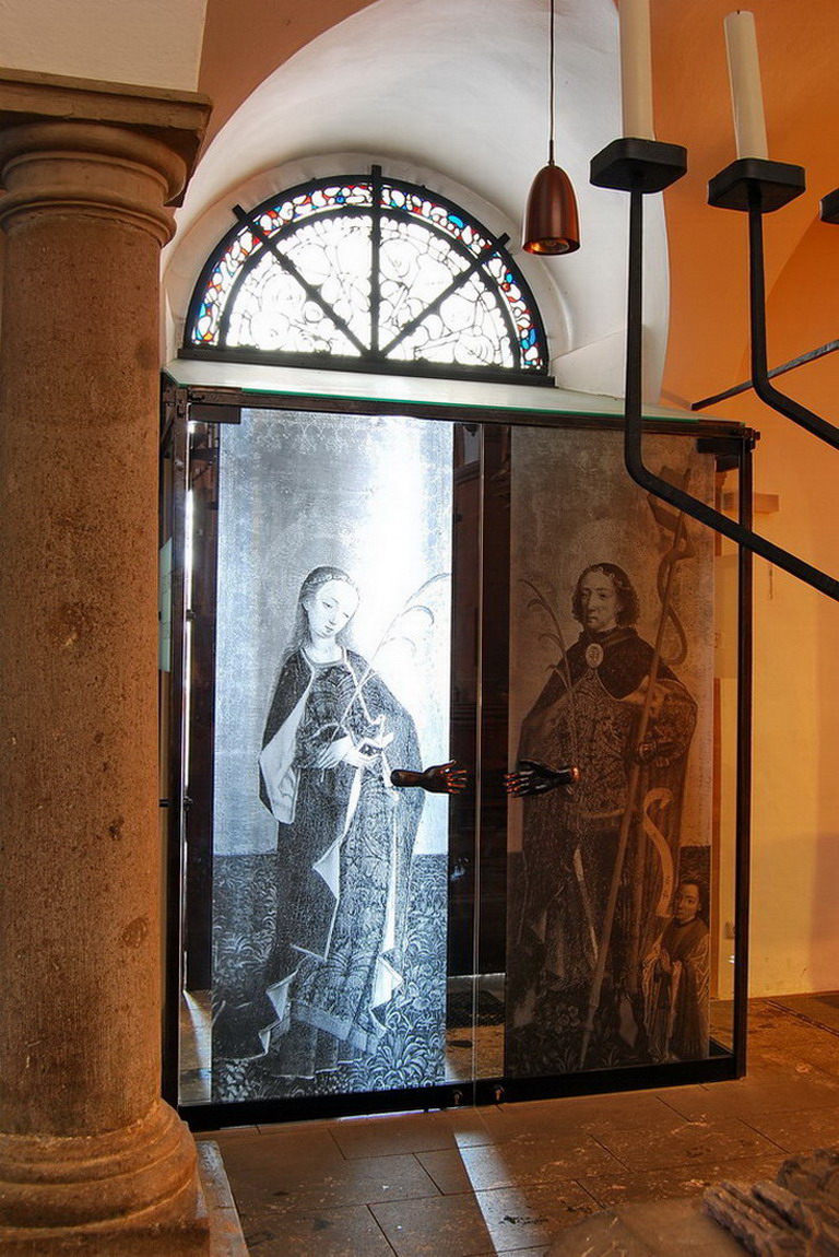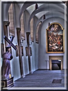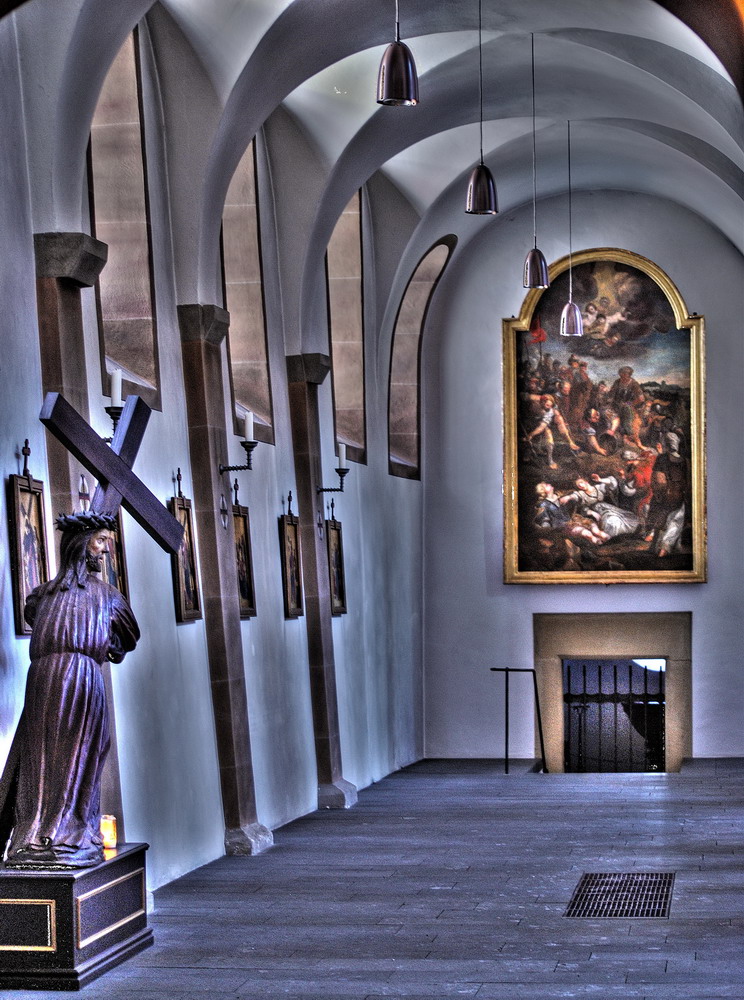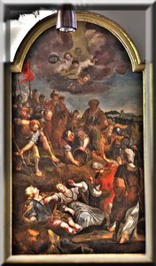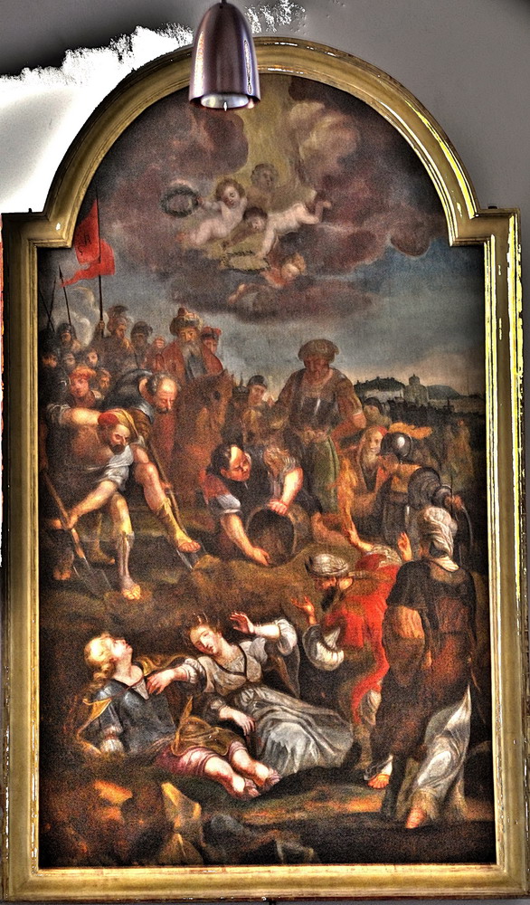 Ein großes Bild aus dem Hochaltar der Barockzeit hängt linke Hand über dem Eingang zur Krypta und zeigt das Martyrium der Pfarrpatrone, wie sie bei lebendigem Leibe an der Via Salaria in Rom in einer Kiesgrube begraben werden.