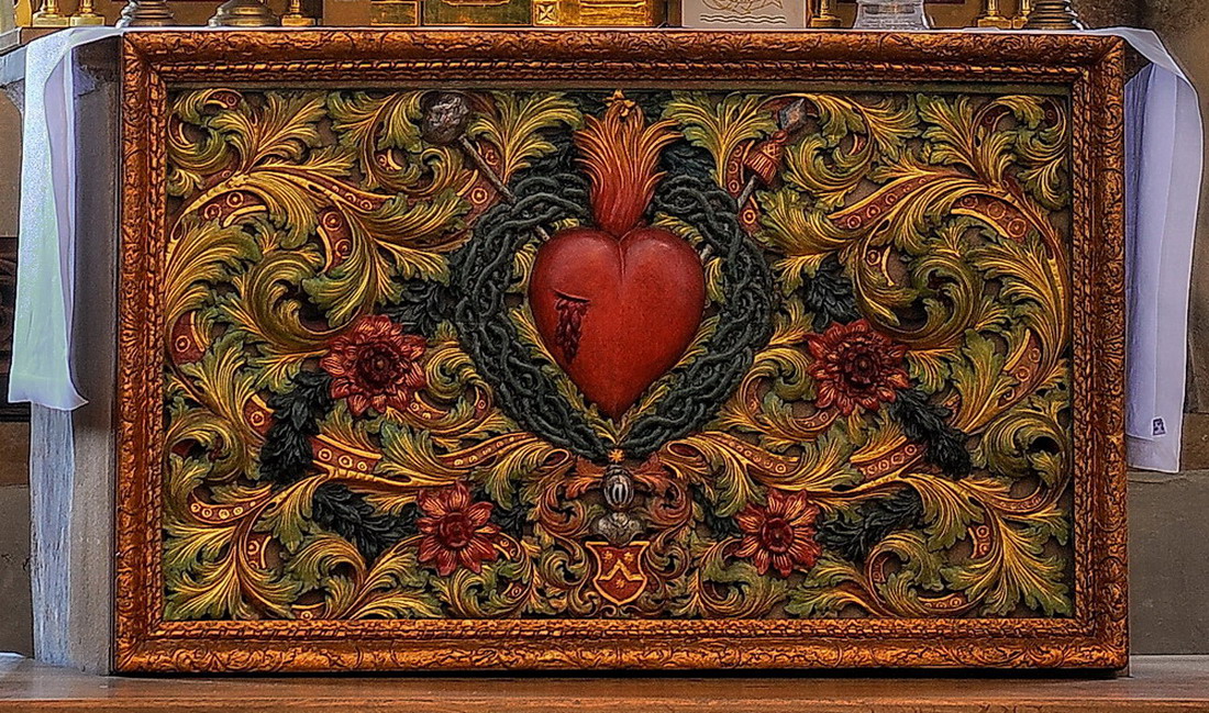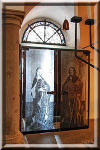 Im Mittelgang, hinter einem Gitter unter dem Altar, befinden sich in einem Schrein die Gebeine der Pfarrpatrone Chrysanthus und Daria.