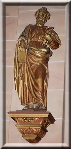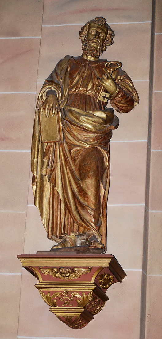 Barocke Figuren der Pfarrpatrone Chrysanthus und Daria befinden sich links und rechts auf Konsolen im Chor, sowie die Figuren der heiligen Aposteln Petrus und Paulus an den Pfeilern des Westwerkes.