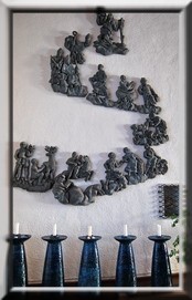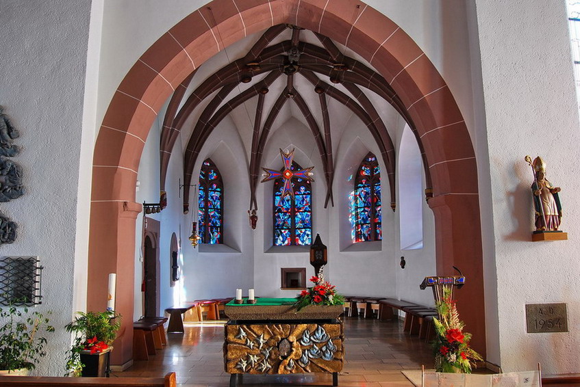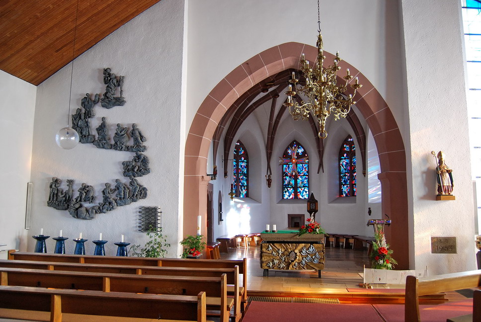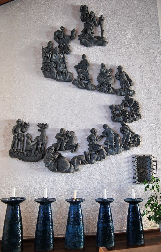 Ein Relief der 14 Nothelfer befindet sich im Inneren der Kirche, das von Prof. Eberhard Linke aus Mainz erschaffen wurde. Die 14 Nothelfer, die in Berk verehrt werden, sind die Bischöfe Erasmus, Dionysius, Blasius, die Jungfrauen Margaretha, Katharina, Barbara, die ritterlichen Heiligen Eustachius, Georg, Achatius, der Diakon Cyriokus, der Arzt Pantaleon, der Knabe Vitus, der Mönch Ägidius und Christopherus als Träger des Christuskindes.