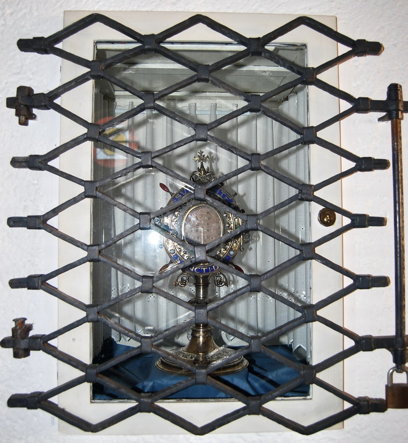 Unterhalb des Nothelfer Reliefs befindet sich in einem Tresor ein Reliquienbehälter mit Reliquien der 14 Nothelfer. Die Inschrift auf dem Behälter lautet: