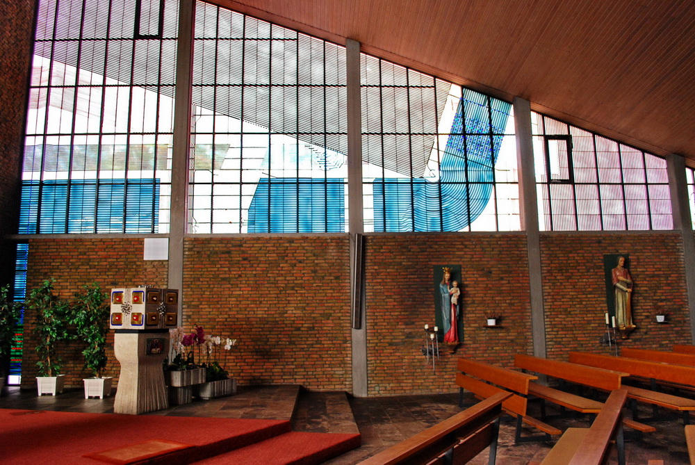 Die modernen Fenster entwarf und gestaltete der Aachener Künstler Ludwig Schaffrath.