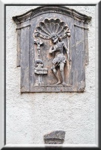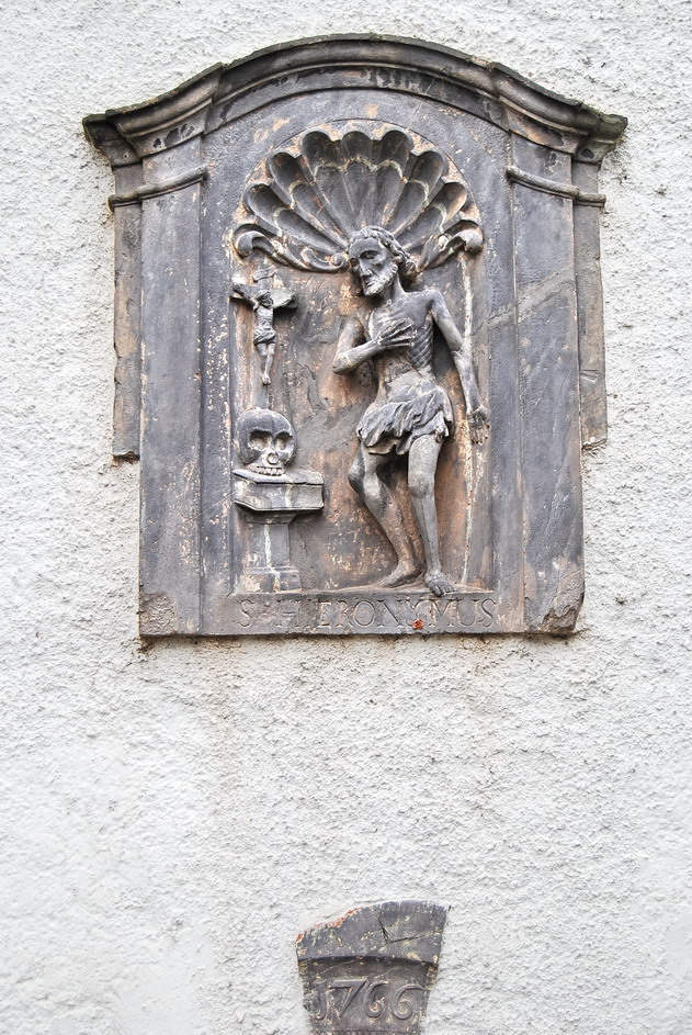 An der Außenwand der Pfarrkirche befindet sich eine Darstellung des Hl. Hieronymus, der sich als ergebener Büßer vor einem Totenschädel und einem Kruzifix mit einem Stein auf die Brust klopft. Darunter ist ein Stein mit der Jahreszahl 1766 ins Mauerwerk eingelassen.