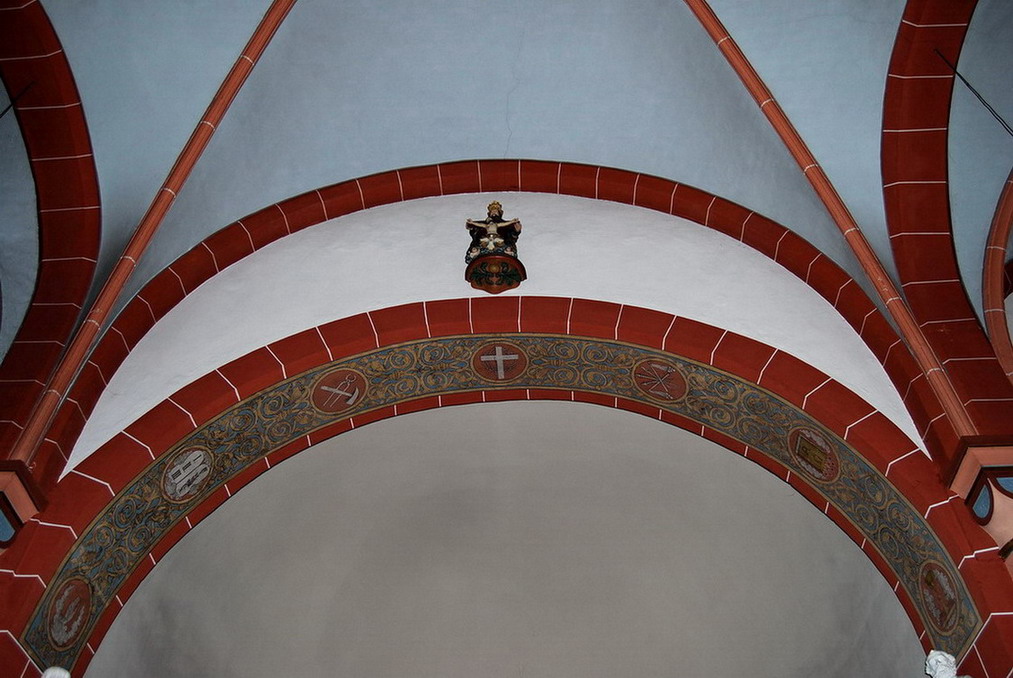 Der "Gnadenstuhl" ist eine ca. 110cm hohe Holzfigur, die 1926 neu gefaßt wurde und sich oberhalb des Triumpfbogens befindet. Sie stellt Gottvater dar, mit weitem Mantel, sowie Christus am Kreuze in Halbfigur und einer Taube zu seinen Füßen.