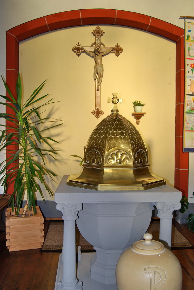 - das auf vier Säulen stehende Taufbecken mit einer achteckigen Deckelhaube, vermutlich aus Messingblech