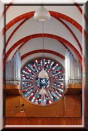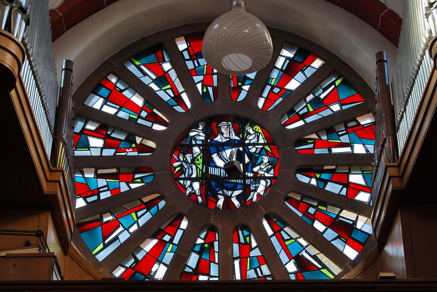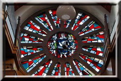 - das über dem Eingangsportal befindliche, farbenprächtige Rundfenster mit seinen 16 Elementen sowie einer modernen Darstellung im Zentrum des Fensters