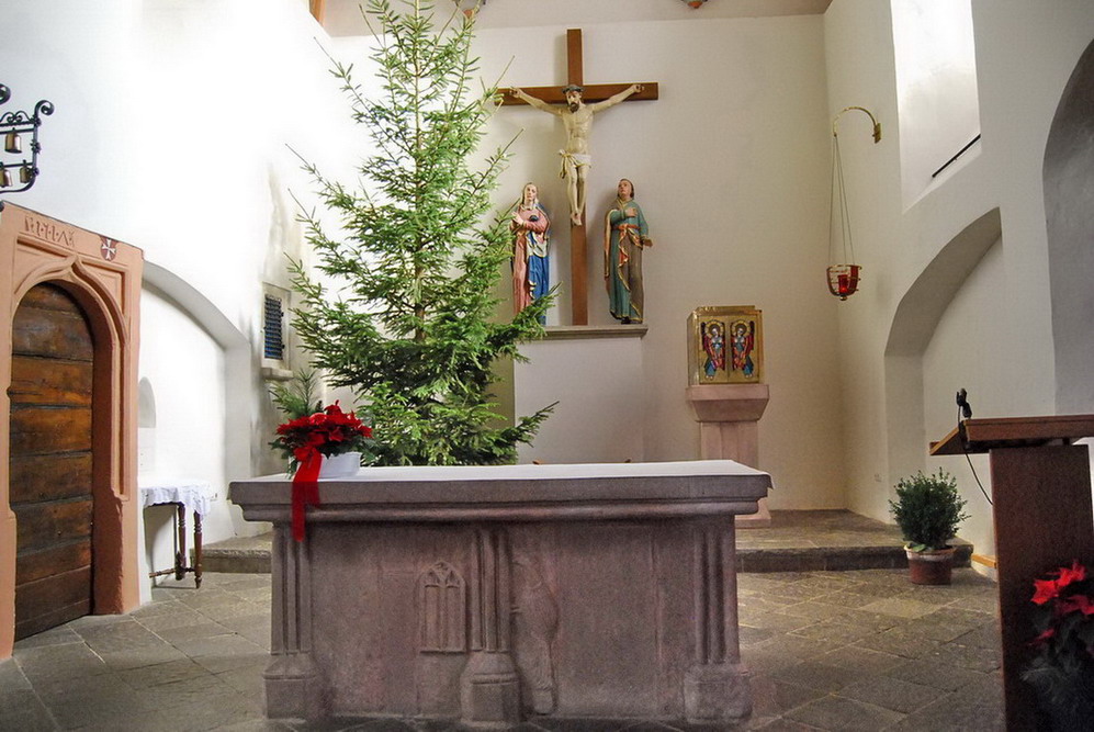 Vermutlich aus der Erbauungszeit stammt der mit einem Pfauenmotiv ausgestattete Altar, die aus Holz gefertigte, lebensgroße Kreuzigungsgruppe ist spätgotisch. Zwischen Chor und Hauptschiff wurden 1952 bei Renovierungsarbeiten auf dem Bogen das Relief der fünf klugen und der fünf törichten Jungfrauen entdeckt.