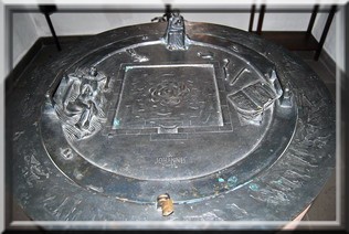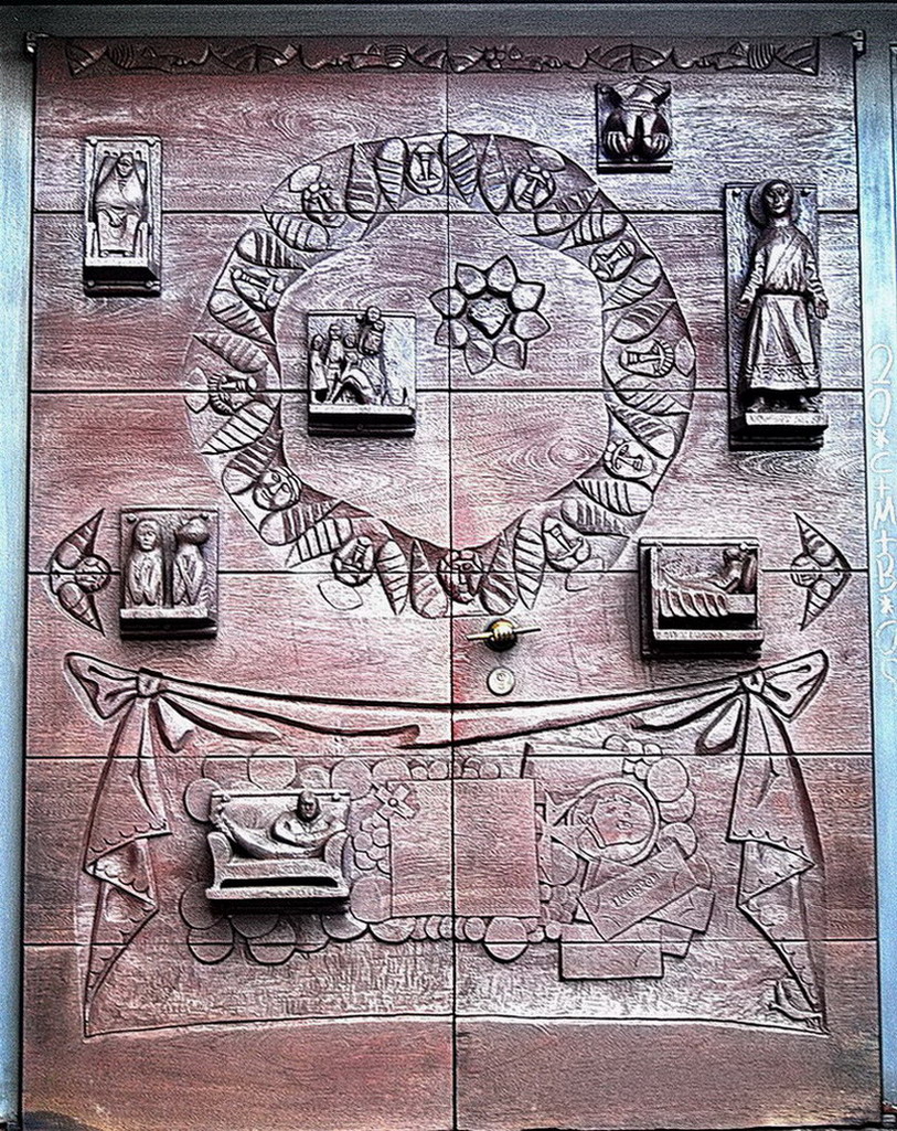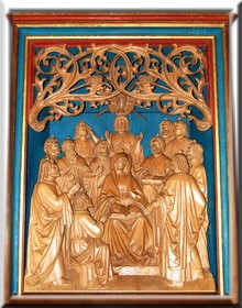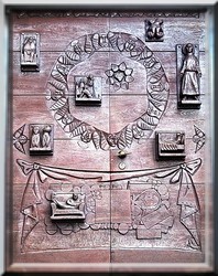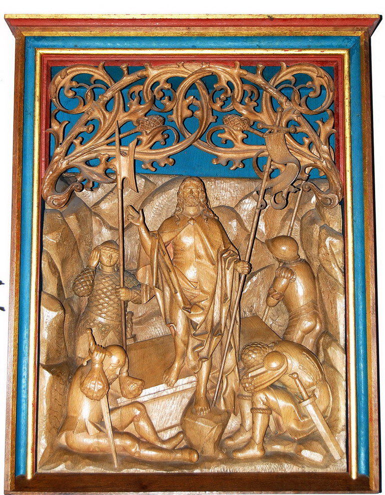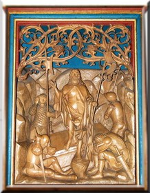 An den vier Seiten des Altarsockels sind Darstellungen aus der Bibel zu finden, wie z. B. an der Vorderseite das Lamm Gottes und das himmlische Jerusalem.