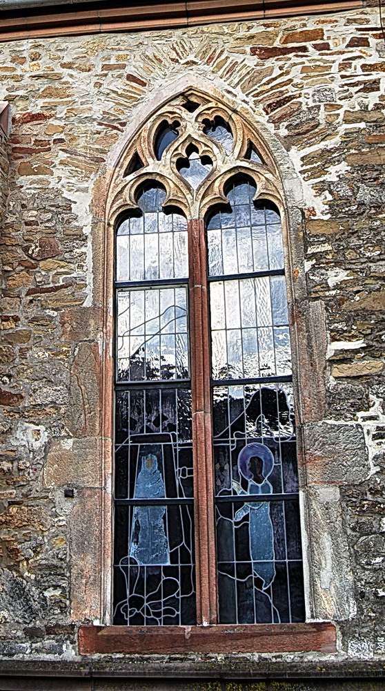 Zwei Halbfenster auf der linken Seite sollen den Betrachter dazu anregen, seiner Fantasie freien Lauf zu lassen. Ein Teil der Verglasung im oberen Bereich stammt jeweils aus den Jahren vor 1945.
