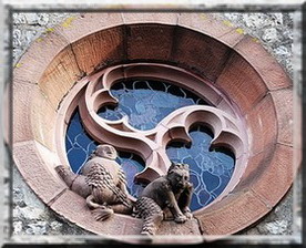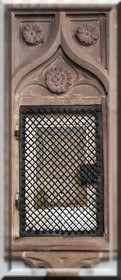 In der Mitte zwischen diesen Figuren sieht man eine Mittelrose, wie man sie auch auf Kreuzblumen, sowie oberhalb des Tabernakels findet.