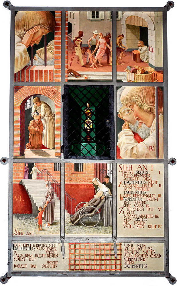 Auf der Südseite der Ostwand befindet sich dagegen eine Laurentiustafel, die in sechs Bildern das Leben des Heiligen darstellt. Eine Nische inmitten der Bilder bewahrt das Laurentius Reliquiar auf, das mit einem Gitter gesichert ist.