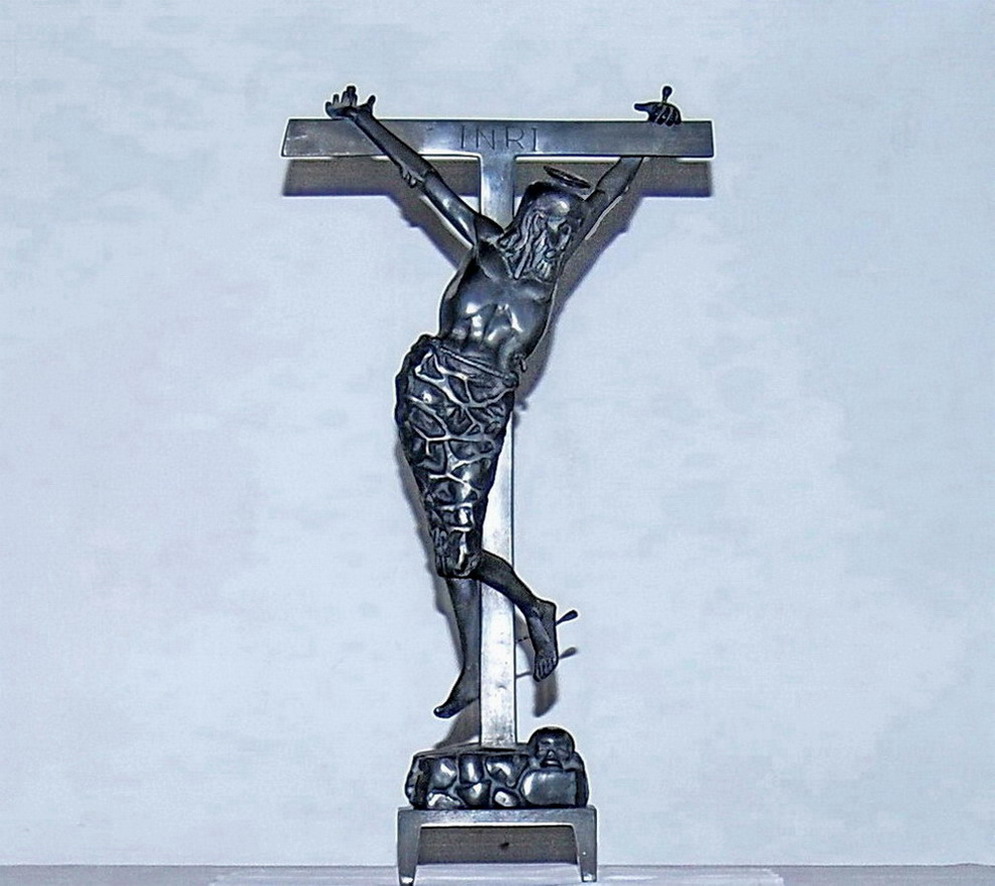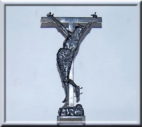 Das moderne Altarkreuz, von dem Künstler Klaus Balke geschaffen, besteht aus Zinn und zeigt beeindruckend das starke Leiden Christi.