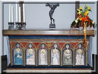 Unterhalb der Altarplatte sieht man von links nach rechts Abbildungen von folgenden Propheten und Heiligen: