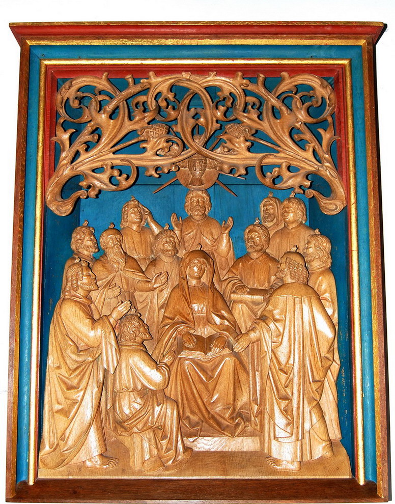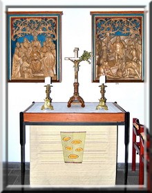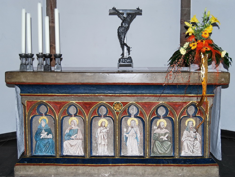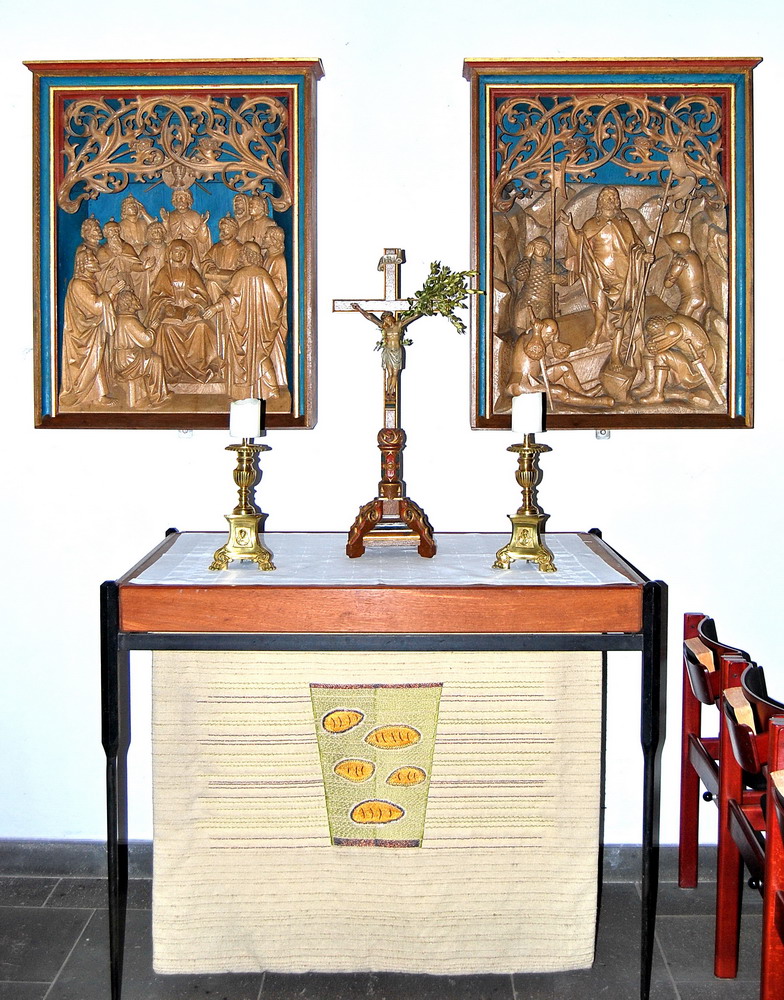 Die von den Gebrüdern Schmidt aus Marmagen gefertigten Relieftafeln zeigen zum einen die "Sendung des Heiligen Geistes" und zum anderen "Die Auferstehung des Herrn". Diese Altarzwischenlösung bestand aus einer Holzplatte mit geschmiedeten Beinen und wurde 1994 von Pfarrer Wolfgang Frisch durch einen neuen Altar ersetzt.