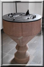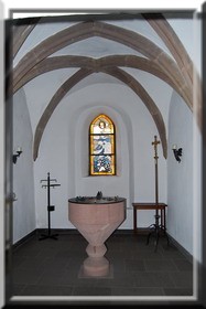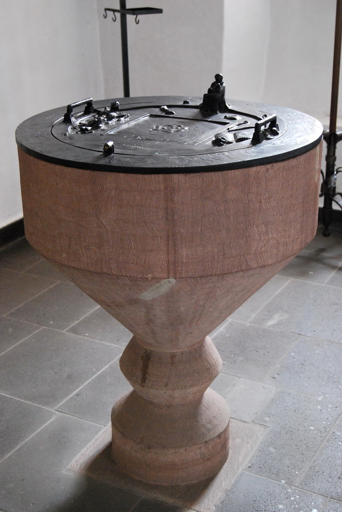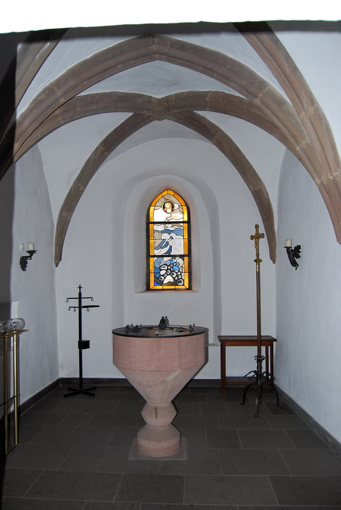 In der Mitte des Raumes steht das mächtige Taufbecken, dessen Sockel aus Marmor um 1970 gefertigt wurde.