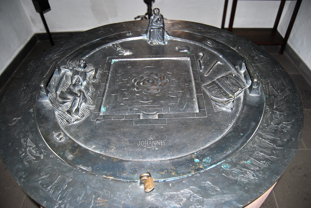Der bronzene Deckel des Taufbeckens wurde von Jochen Pechau aus Köln gefertigt und symbolisiert eine Zisterne in Jerusalem, in der Kranke und Gebrechliche geheilt wurden. Er ist mit diversen Figuren verziert, unter anderem eine Darstellung der Mutter Gottes mit dem Jesuskind.