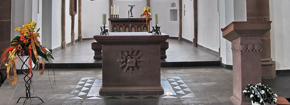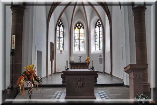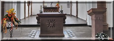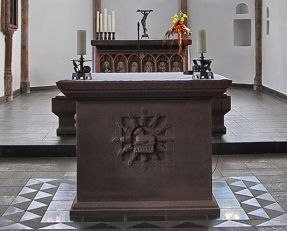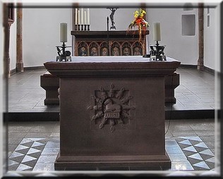 Dieser Altar, der dem spätgotischen Altar vorgelagert ist, besteht aus rotem Eifelsandstein, während die Altarplatte aus rotem Veronamarmor gearbeitet ist.