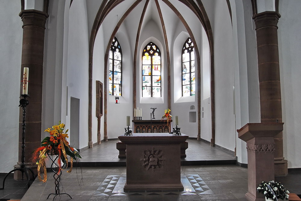 Die ältesten Bauteile der Kirche sind die ehemalige Sakristei, die jetzt als Taufkapelle fungiert, sowie der lichtdurchflutete Chorraum mit seinem spätgotischen Altar aus dem 14. Jahrhundert, der von R. und D. Keulen restauriert wurde.