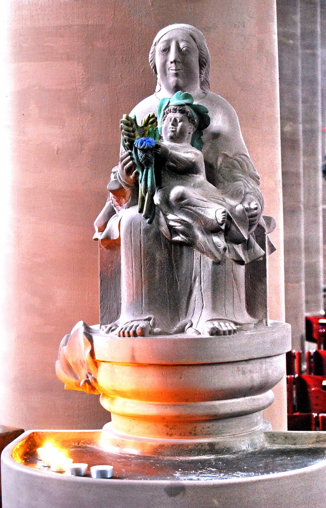 Im hinteren Bereich der Kirche steht vor einem der Pfeiler auf der linken Seite eine Marienstatue. Sie wurde 1975 von Jochen Pechau als Sandsteinplastik geschaffen und zeigt Maria milde lächelnd mit dem Jesuskind auf ihrem Schoß, das mit Blumen und Ähren spielt.