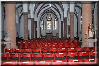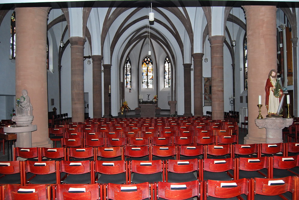 Beim Betreten der Kirche fällt die moderne Ausrichtung des Kircheninneren auf. Anstelle von Bänken, sitzen hier die Gläubigen in Stuhlreihen, die miteinander verbunden sind. Das Gewölbe besteht aus zahlreichen Rippen, die auf mächtigen Pfeilern aus Eifeler Sandstein ruhen.