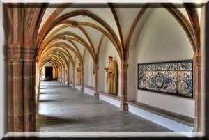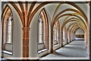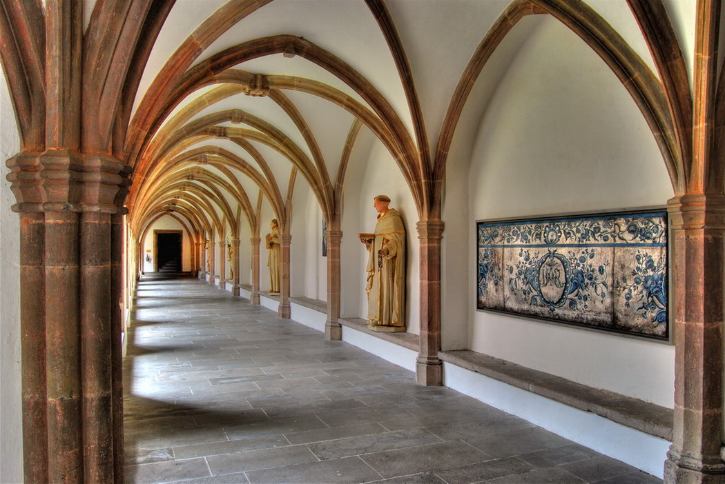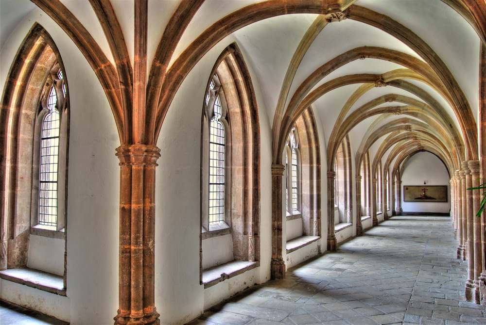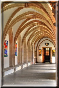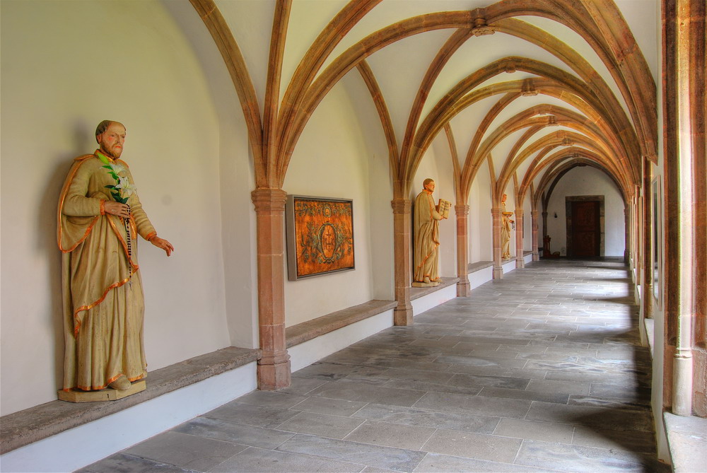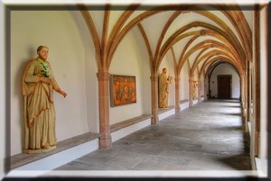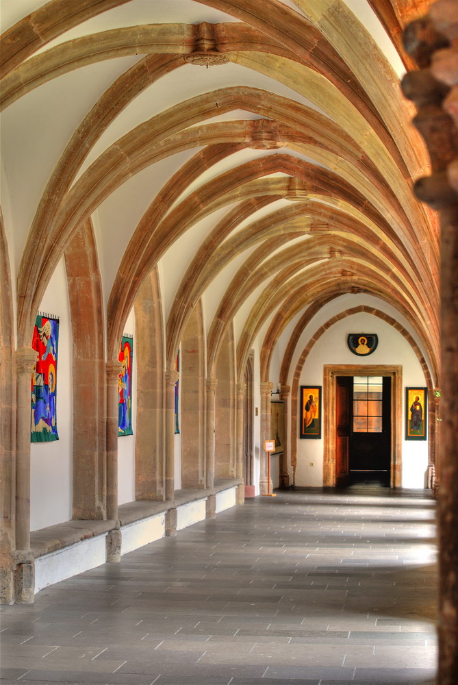 Der Kreuzgang, der ehemals romanischen Ursprung hatte, wurde von 1492 bis 1517 durch einen gotischen Stil ersetzt. Die darüber hinaus prachtvollen Glasfenster in den Gängen, die zwischen 1526 und 1557 entstanden, mußten mehrfach vor marodierenden Banden geschüzt werden. Durch die Säkularisation 1802 verschwanden sie hauptsächlich nach England, wo sie sich teils im Privatbesitz befinden, aber zum Großteil im Victoria und Albert Museum. Lediglich zwei Scheiben konnten wieder nach Steinfeld geholt werden und befinden sich heute im Kreuzgang.