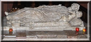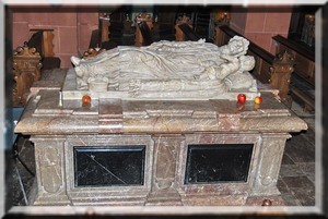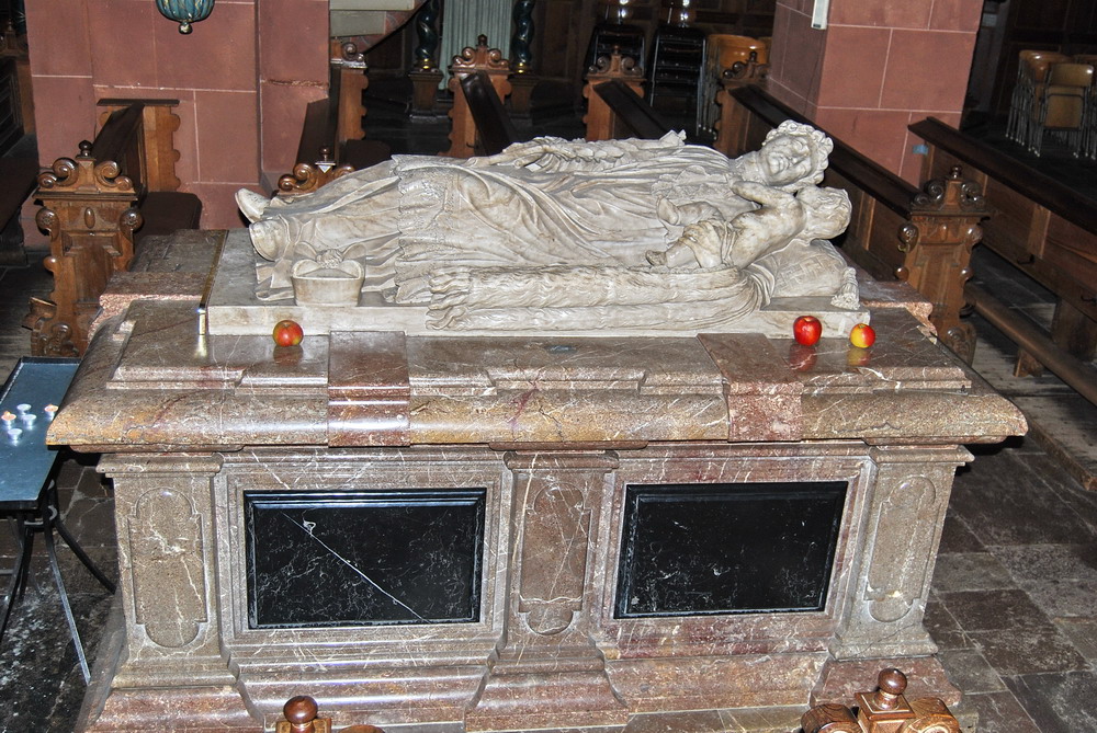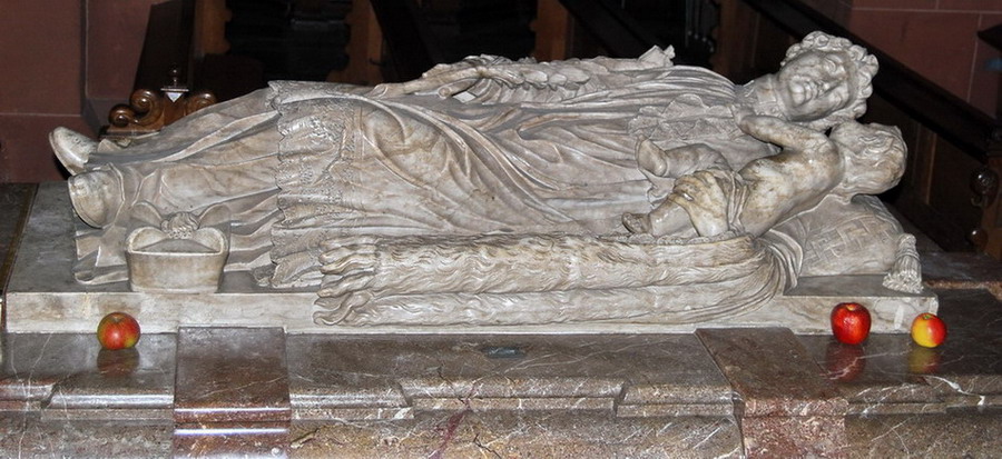 während die Platte mit einer liegenden Figur aus dem Jahre 1732 stammt un aus Alabaster gefertigt wurde. Die frischen Äpfel auf dem Grabmal gehen auf eine Legende zurück, nach dem Hermann Josef dem Jesuskind in der Kirche St. Maria im Kapitol zu Köln einen Apfel angeboten hat, den es auch angenommen haben soll.
