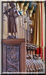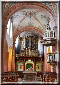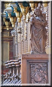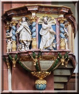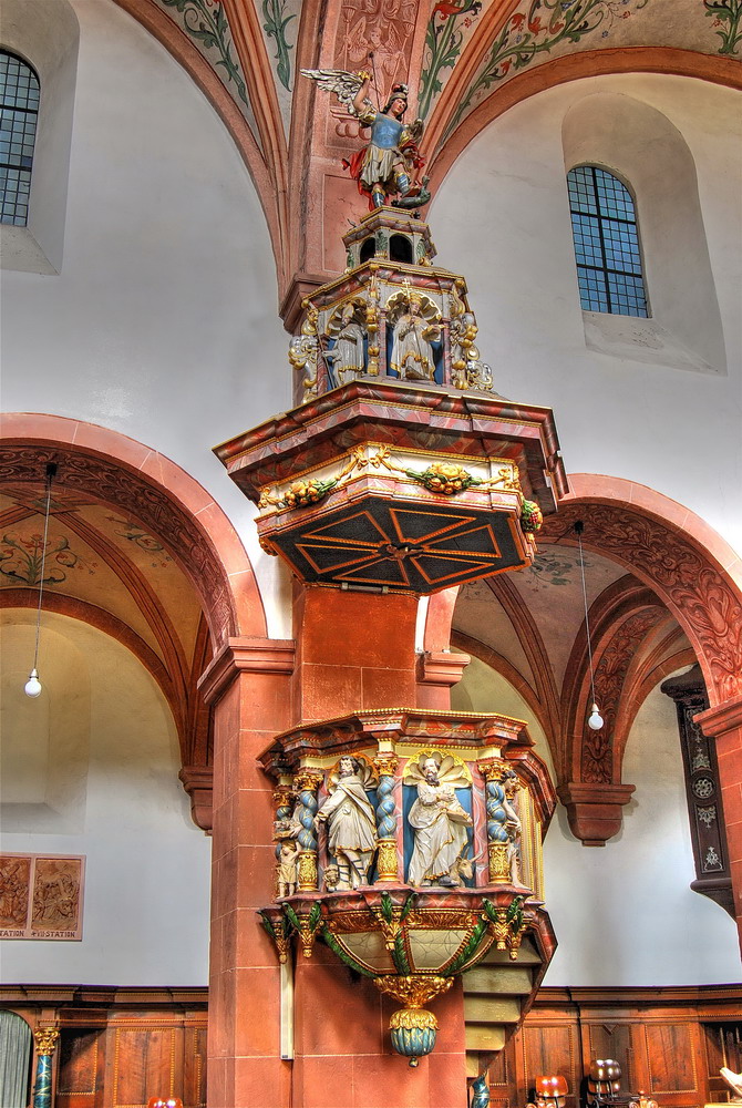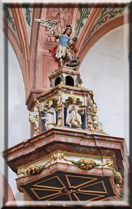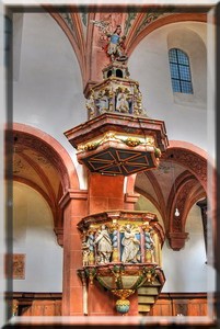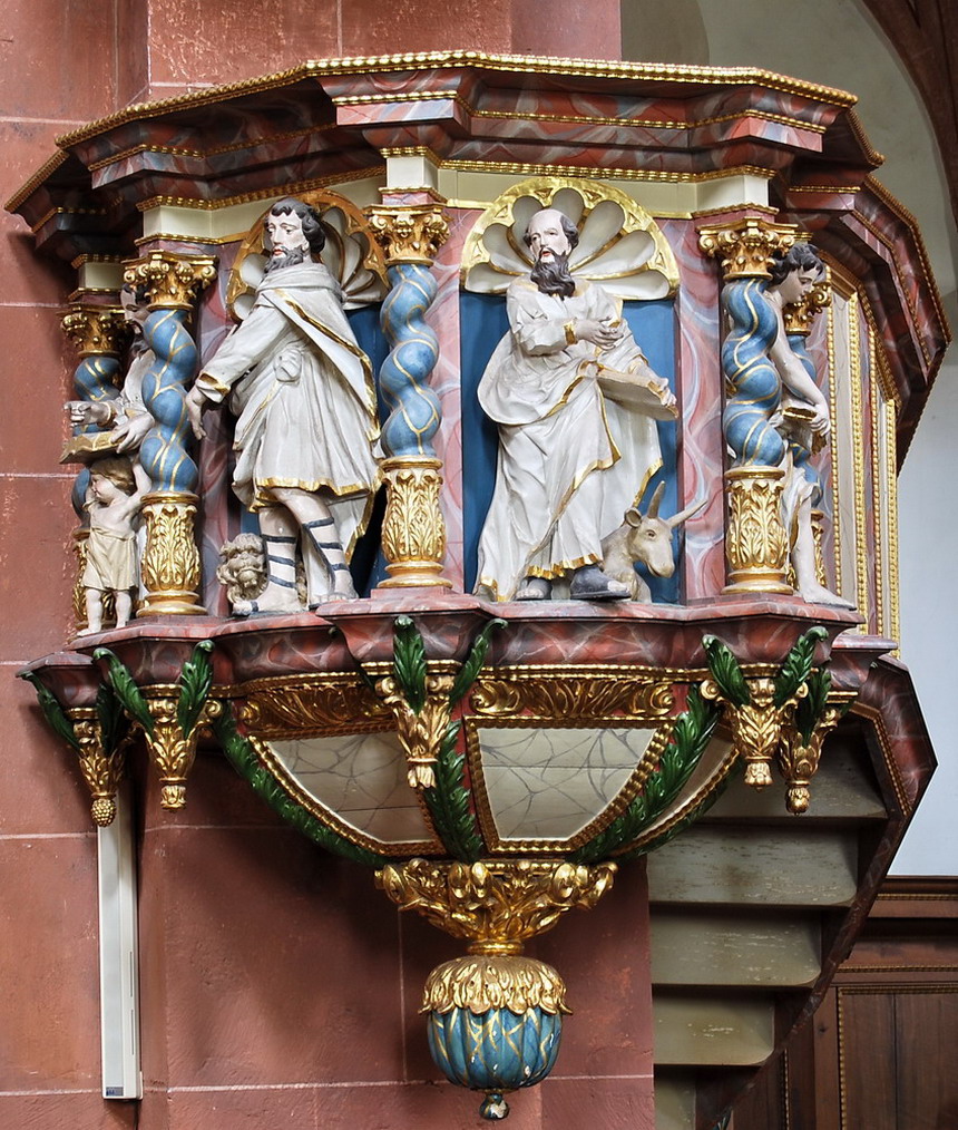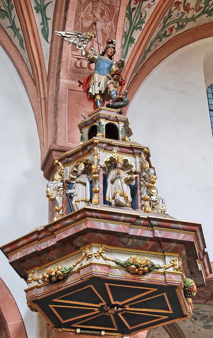 Oberhalb des Sarkophags befindet sich die Holzkanzel aus dem späten 17. Jahrhundert. Im Kanzelstuhl sieht man die vier Evangelisten in Muschelnischen, jeweils getrennt von gedrehten Säulen.