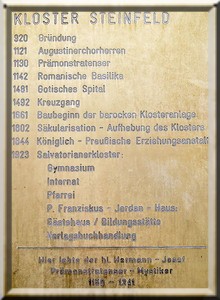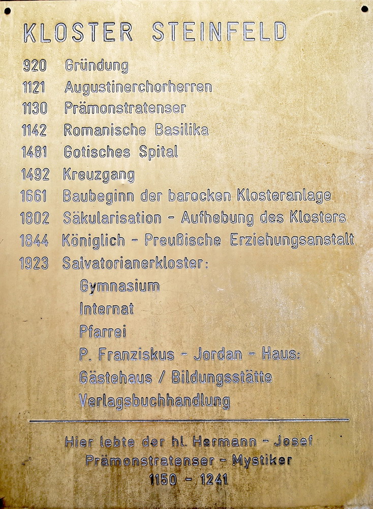 Weithin sichtbar liegt das Salvatorianer Kloster Steinfeld in der Nordeifel. Das nur wenige Häuser zählende Dorf Steinfeld gehört zur Gemeinde Kall und verfügt über eines der besterhaltensten Klöster des Rheinlandes, das auf eine über 1000 jährige Geschichte zurückblicken kann.