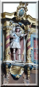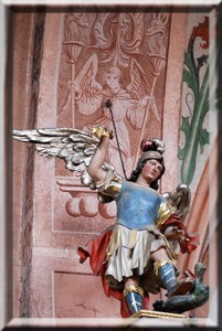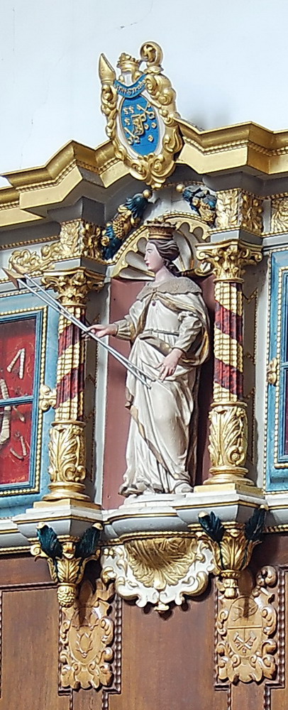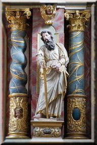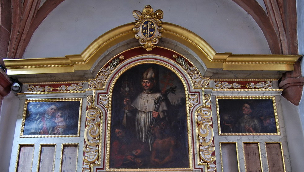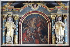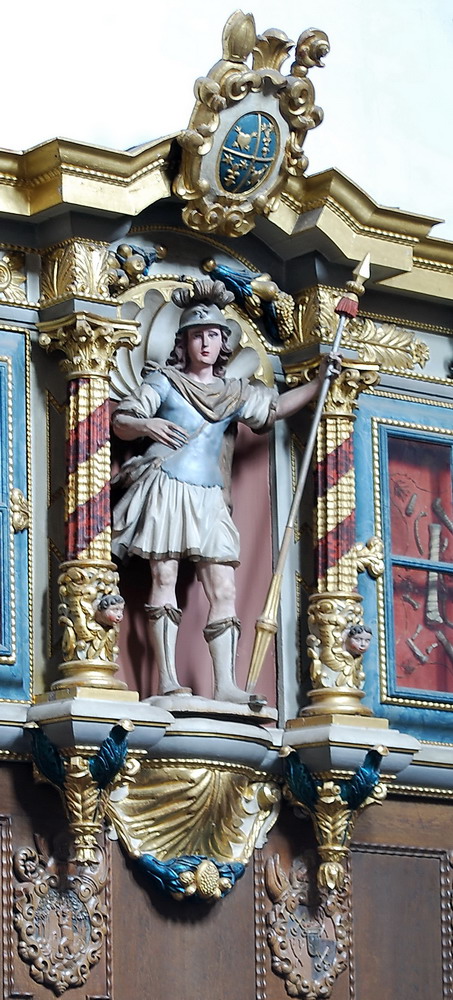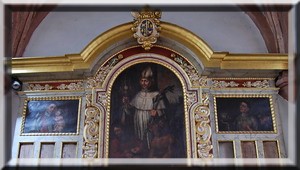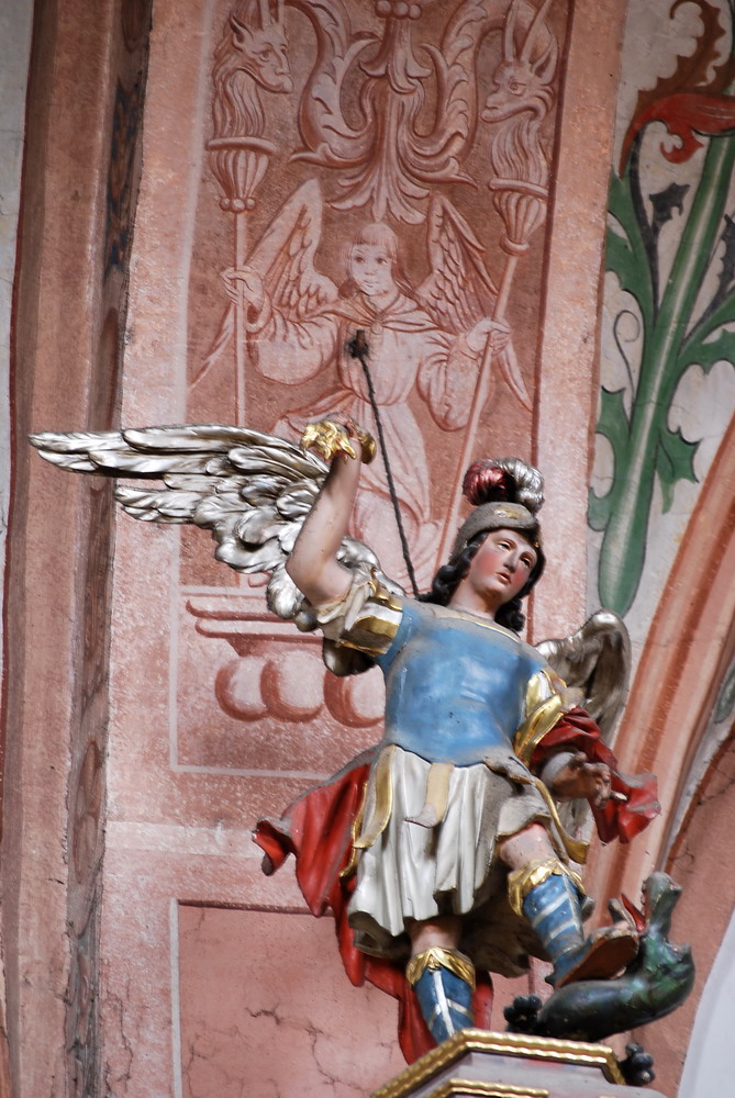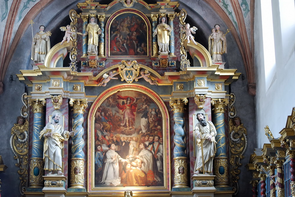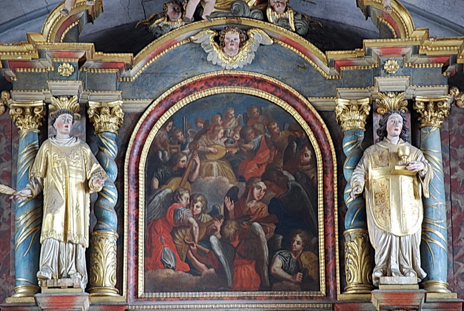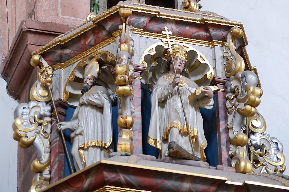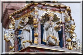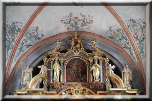 Die Figuren links und rechts in den Nischen der Reliquiengehäuse stellen wohl den Hl. Michael, sowie die Hl. Ursula dar.