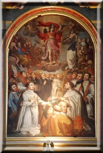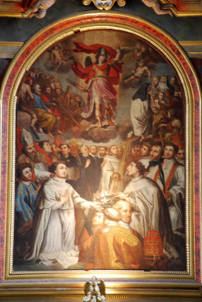Es zeigt die Zusammenkunft der Ordensstifter unter dem Heiligenhimmel, sowie im Hintergrund den auf Wolken schwebenden Erzengel Michael.