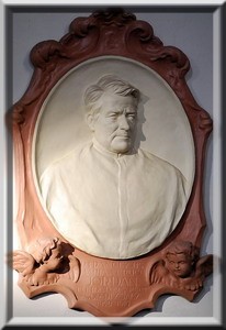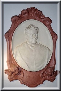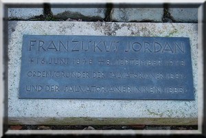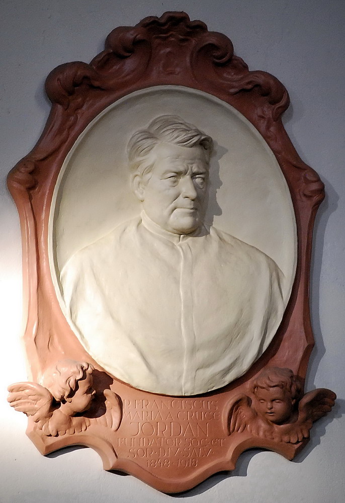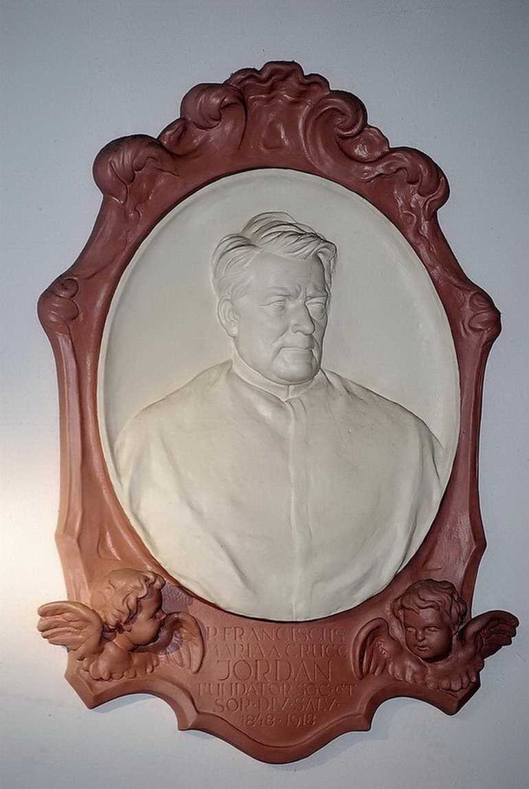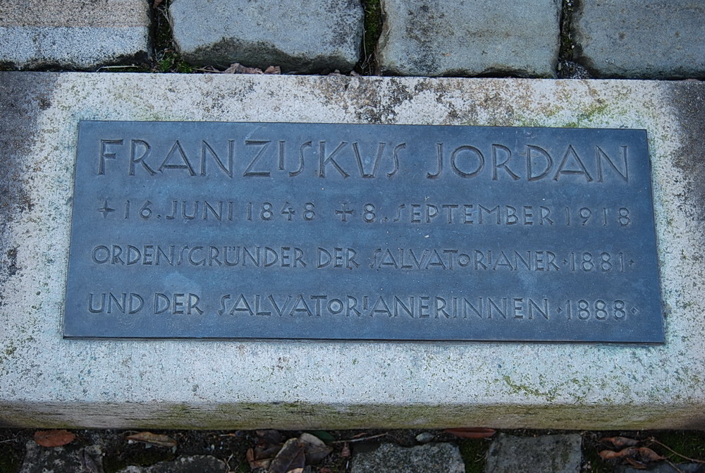 Eine Gedenktafel mit dem Brustbild von Pater Franziskus Jordan, umrahmt von zwei Engelsköpfen, erinnert an den Gründer des Salvatorianerordens.