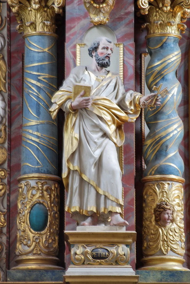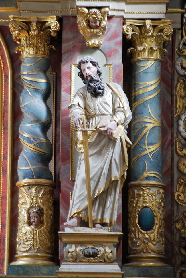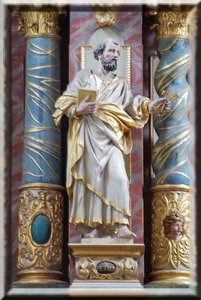 Seitlich des jeweiligen Gemäldes befinden sich zwischen zwei Säulen mit korinthischen Kapitellen die Heiligen Petrus auf der linken und Paulus auf der rechten Seite. Oberhalb des zentralen Ölgemäldes zeigt im Aufbau ein kleineres Gemälde das Pfingstwunder.