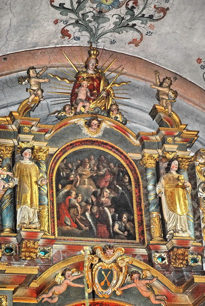Am obersten Ende des Hochaltars befindet sich die gekrönte Muttergottes als Halbfigur mit dem Jesuskinde, von einem Strahlenkranz umgeben.