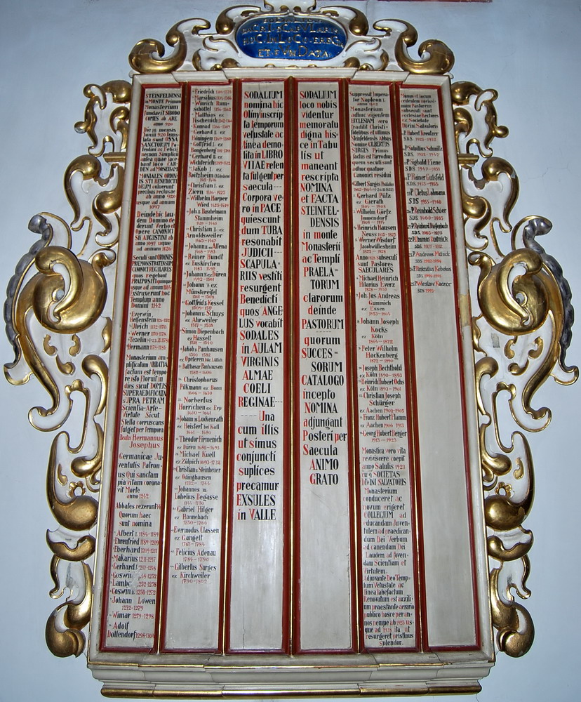 Eine 1663 angefertigte Bruderschaftstafel weist auf die von Abt Johann VII. gegründete Skapulierbruderschaft hin, wie ein Inschriftovalam oberen Abschluß beweist. Die Tafel ist 120 cm breit und verfügt über zahlreiche, aufgenagelte Namensschilder.