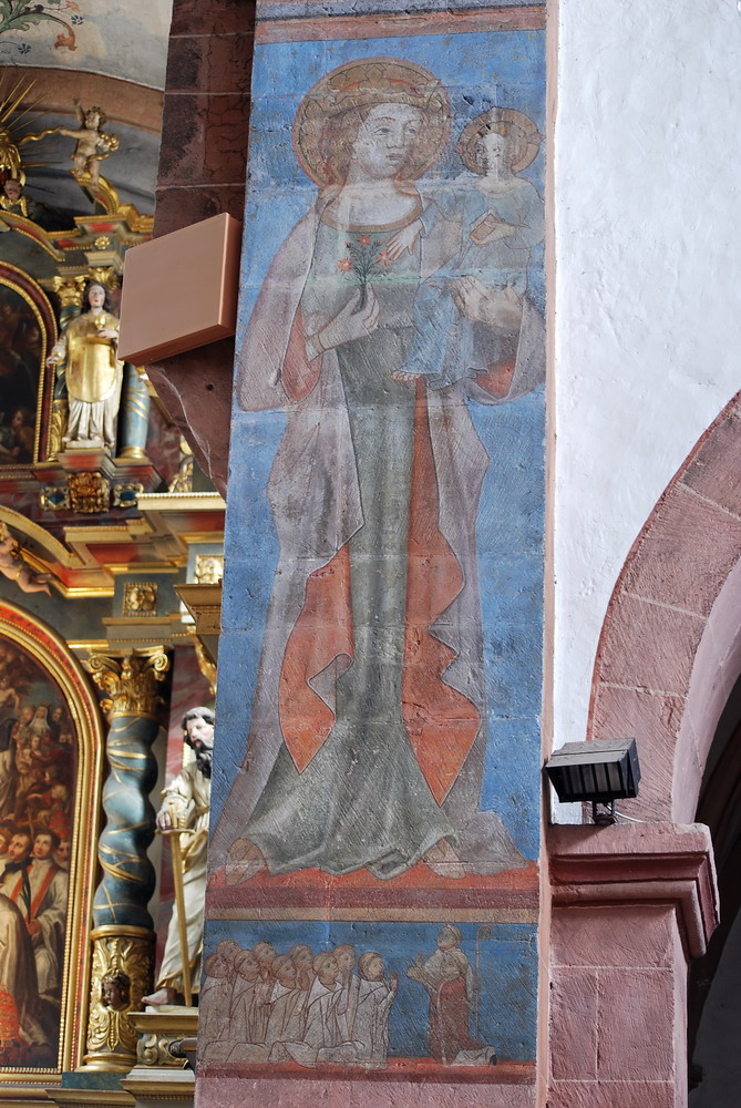 Auf dem rechten Pfeiler sehen wir in bunten Farben die Mutter Gottes, die das Jesuskind in ihrem linken Arm hält. Während es mit der linken Hand ein Buch hält, greift es mit der rechten nach drei roten Blumen. Am unteren Ende des Pfeilers knien paarweise acht Prämonstratenser, mit dem Prior an ihrer Spitze. Mit einem Weihgeschenk in der Hand kniet der Abt, in roter Glockenkasel gekleidet, während hinter ihm ein Priester mit dem Hirtenstab zu sehen ist.