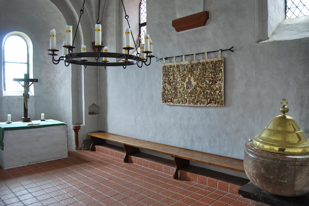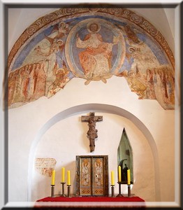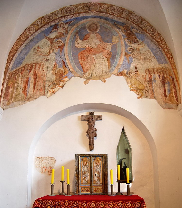 Die einzigartigen Wandmalereien, die in der oftmals getünchten Kirche freigelegt wurden, sind aus dem 14. Jahrhundert, dem 16. Jahrhundert und dem 17. Jahrhundert und gelten als Monumentalmalereien.