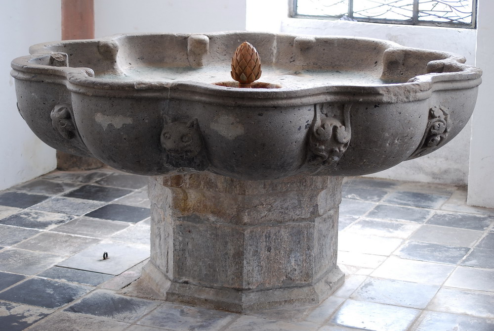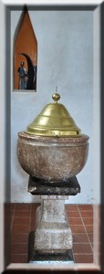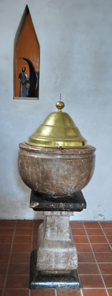 Der vermutlich aus der abgerissenen Andreaskirche stammende Taufstein ist aus rotem Eifelmarmor gefertigt und hat eine Höhe, zusammen mit dem Messingdeckel, von 1.60 m.
