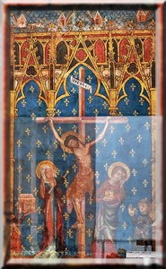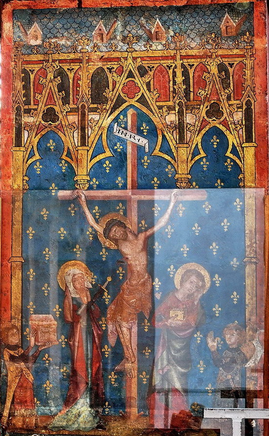 Am Eingang zum südlichen Querschiff befindet sich auf dem Pfeiler, der die beiden Seitenkapellen trennt, ein Wandgemälde, das die Kreuzigung Christi darstellt. Es ist 2.28 m hoch und 1.23 m breit und ist zum Schutze vor Zerstörung mit einer Glasplatte versehen. Das im Jahre 1883 aufgedeckte und 1886 restaurierte Gemälde beeindruckt durch seine gotische Architektur und das auffallend große Kreuz.