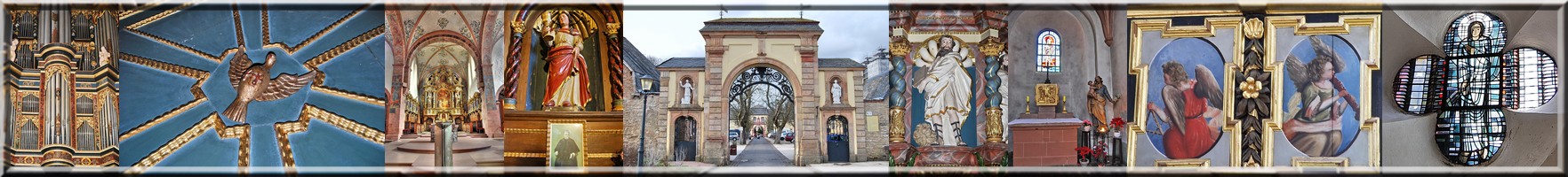 Auf der linken Seite sieht man in der Mittelnische das von zwei Pfeilen durchbohrte Herz, das als Wappen der Abtei gilt, sowie das Wappen des Abtes Michael Kuell, zwei Sterne über einer Lilie, der von 1693 bis 1732 Abt in Steinfeld war und als Kunstliebhaber maßgeblichen Einfluß an der Ausstattung der Kirche hatte.