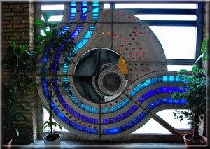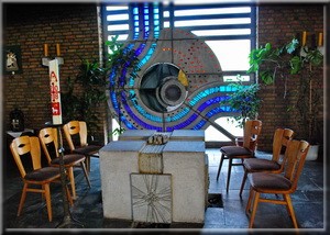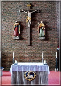 Der schlichte Altar, sowie der Taufstein wurden von Bernhard Gewers aus Hagen künstlerisch geschaffen.