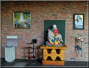 Daneben befindet sich auf einem Holztisch eine Pieta.