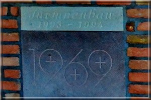 Eine Betonplatte mit der Inschrift "Turmneubau 1993 - 1994", sowie das Datum 1969 erinnern im Kircheneingangsbereich an den Neubau mit dem alten Kirchturm.