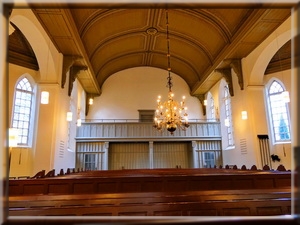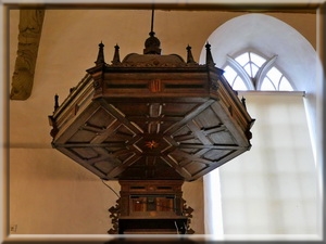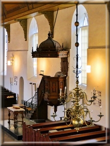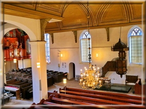 Stattdessen blickt man auf die Kanzel, die Bank unter ihr und den Abendmahltisch, die aus der Renaissancezeit des frühen 17. Jahrhunderts stammen.