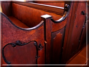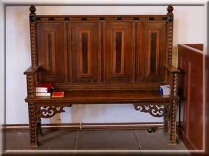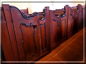 Die zum Teil barocken Bänke unterhalb der Orgel sind reich verziert und weisen teilweise Lederbezüge auf.
